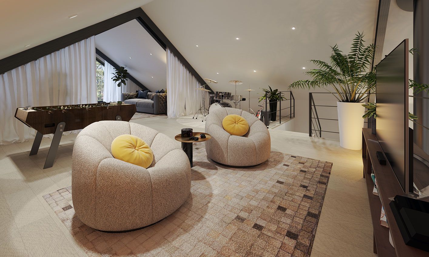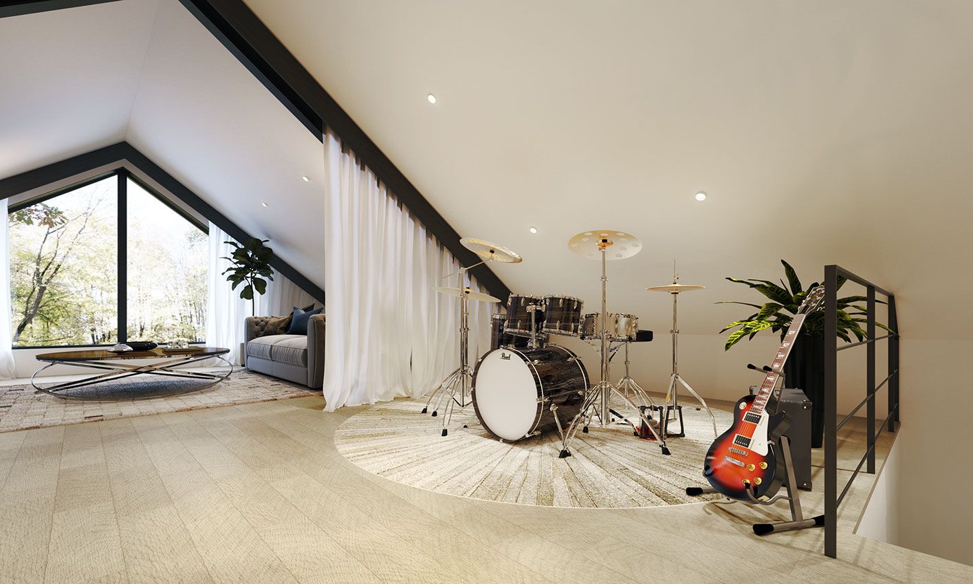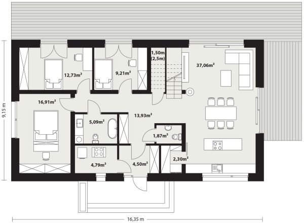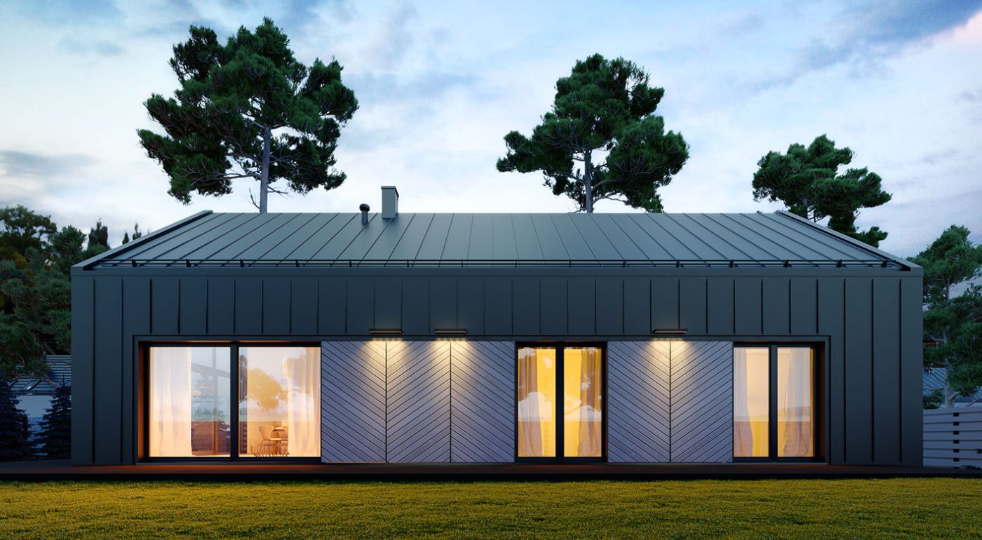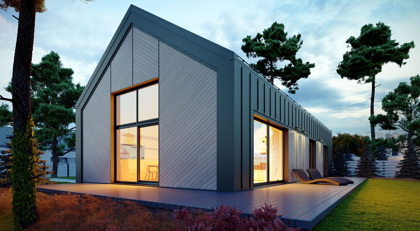 Проект Hana — это дом в стиле современного амбара. Здание без карнизов имеет прямоугольную форму. Большие окна и открытое пространство гостиной придают дому современный характер. В доме предусмотрены инженерные коммуникации на первом этаже ( 109,89 м2 ), а мезонин ( 49,39 м2 ) представляет собой дополнительную площадь, не включенную в полезную площадь, которую можно приспособить под жилое помещение или переоборудовать в мансарду. Дом Ханы прост и функционален, а его интерьер допускает множество вариантов планировки. В стандартной комплектации дом оборудован системой рекуперации тепла и тепловым насосом