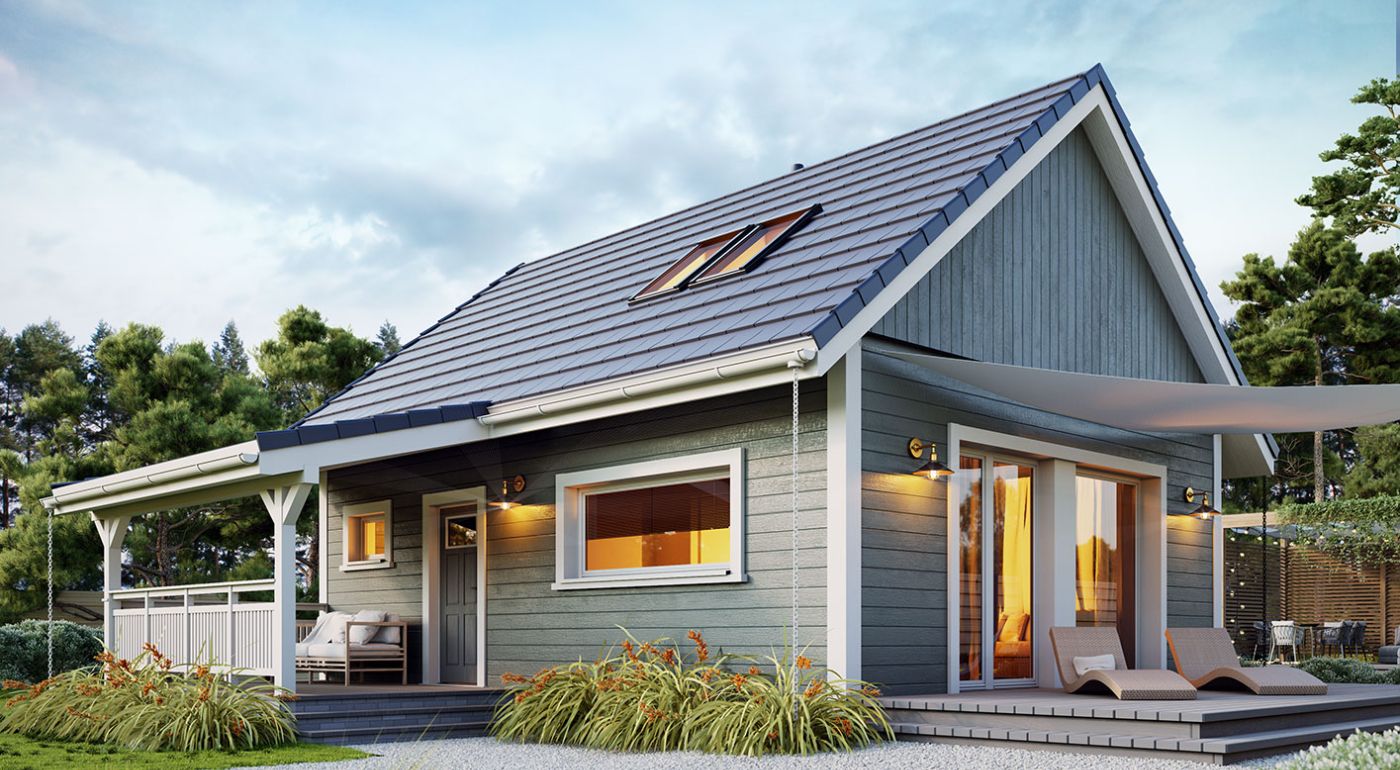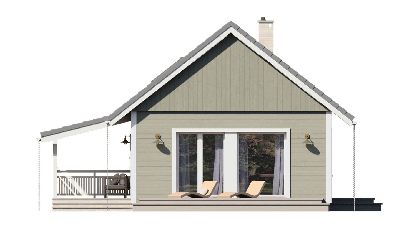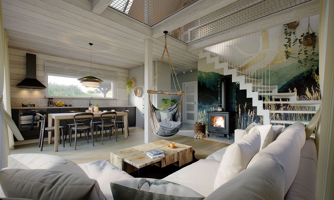 Деревянная эрна — это небольшой односемейный или летний дом. В квартире две спальни, открытая гостиная и мезонин. Площадь застройки составляет 63 м2, возможна постройка по запросу. Дом сочетает в себе традиционную простую форму с современной внутренней планировкой с открытой гостиной и многочисленными остеклениями. Вход в дом через крытую террасу-веранду. Кроме того, гостиная и спальня на первом этаже имеют выход на террасу. Такая конструкция допускает множество различных вариантов компоновки. Чердак можно надстроить и вместо антресоли создать там дополнительные комнаты. В стандартной комплектации дом оборудован тепловым насосом и камином.