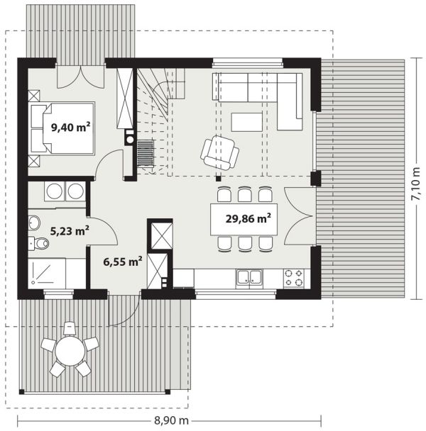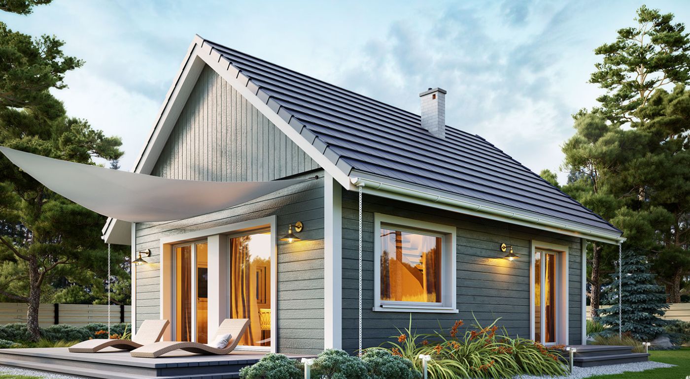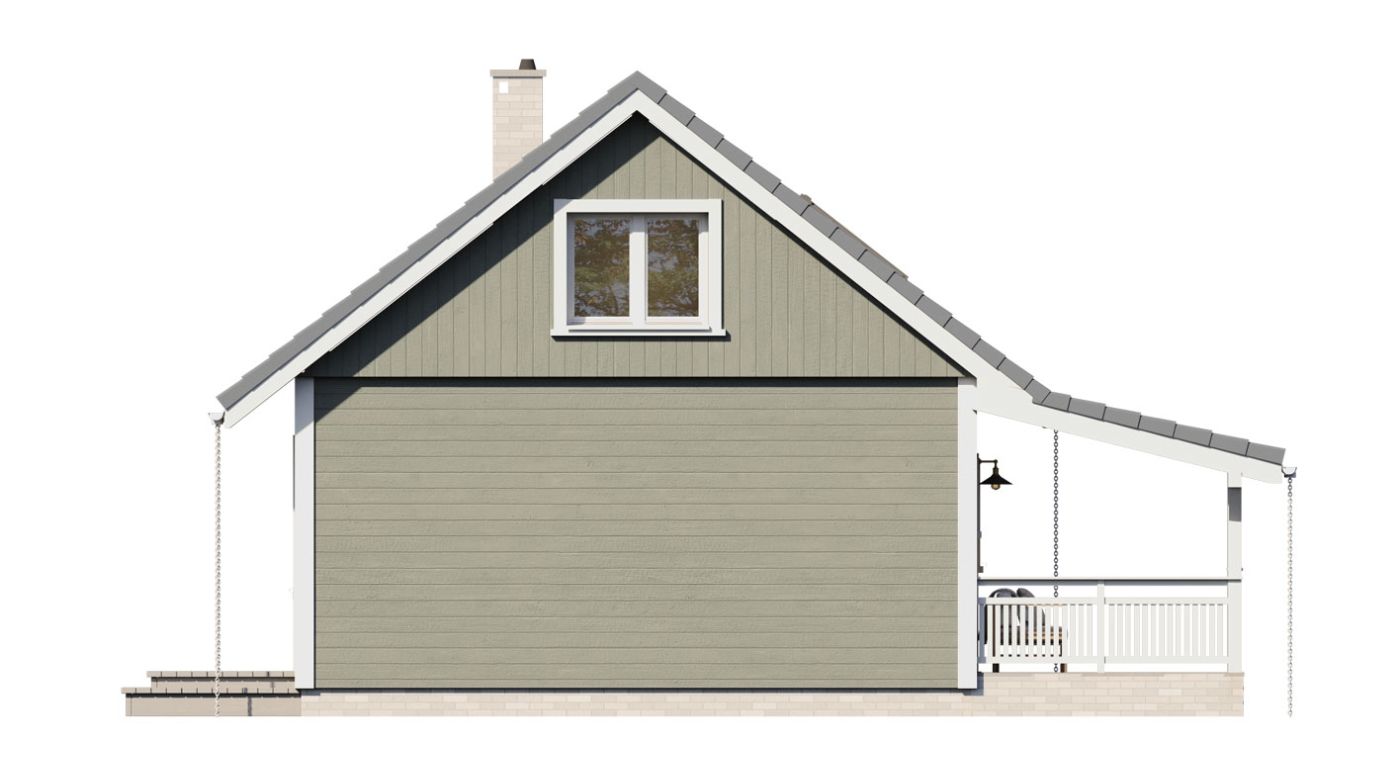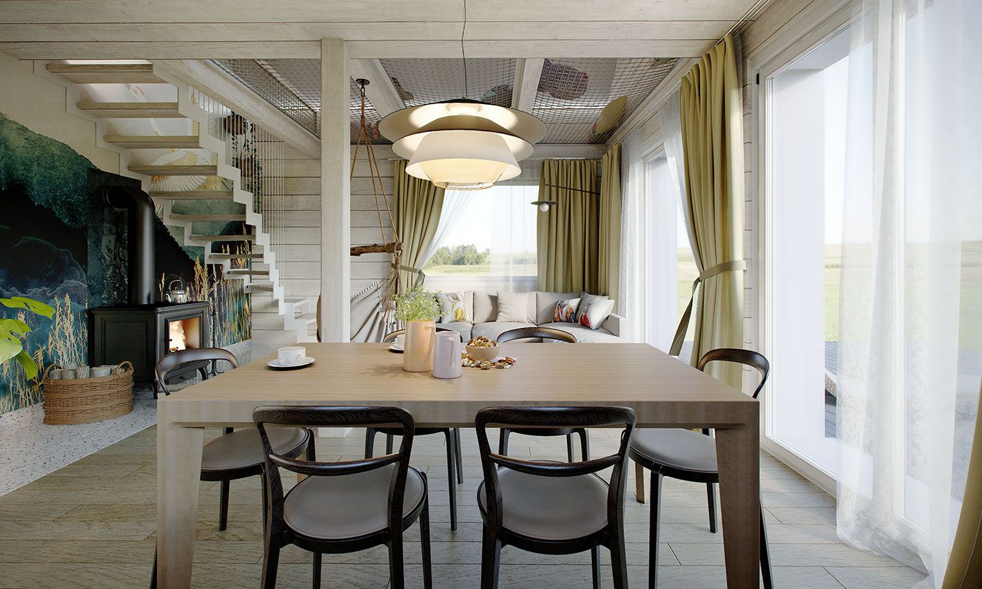 Деревянная эрна — это небольшой односемейный или летний дом. В квартире две спальни, открытая гостиная и мезонин. Площадь застройки составляет 63 м2, возможна постройка по запросу. Дом сочетает в себе традиционную простую форму с современной внутренней планировкой с открытой гостиной и многочисленными остеклениями. Вход в дом через крытую террасу-веранду. Кроме того, гостиная и спальня на первом этаже имеют выход на террасу. Такая конструкция допускает множество различных вариантов компоновки. Чердак можно надстроить и вместо антресоли создать там дополнительные комнаты. В стандартной комплектации дом оборудован тепловым насосом и камином.