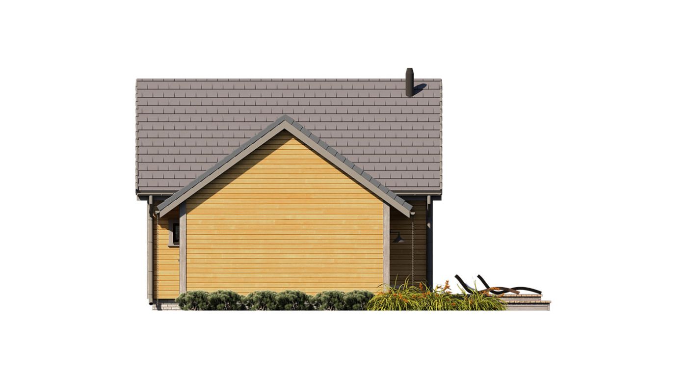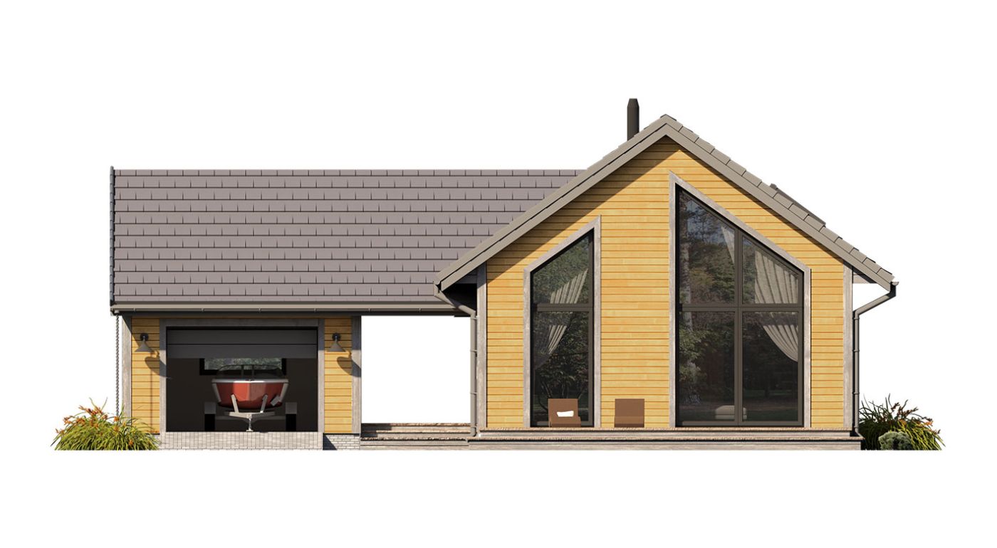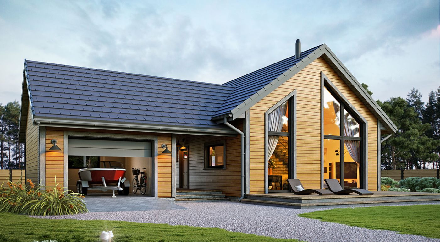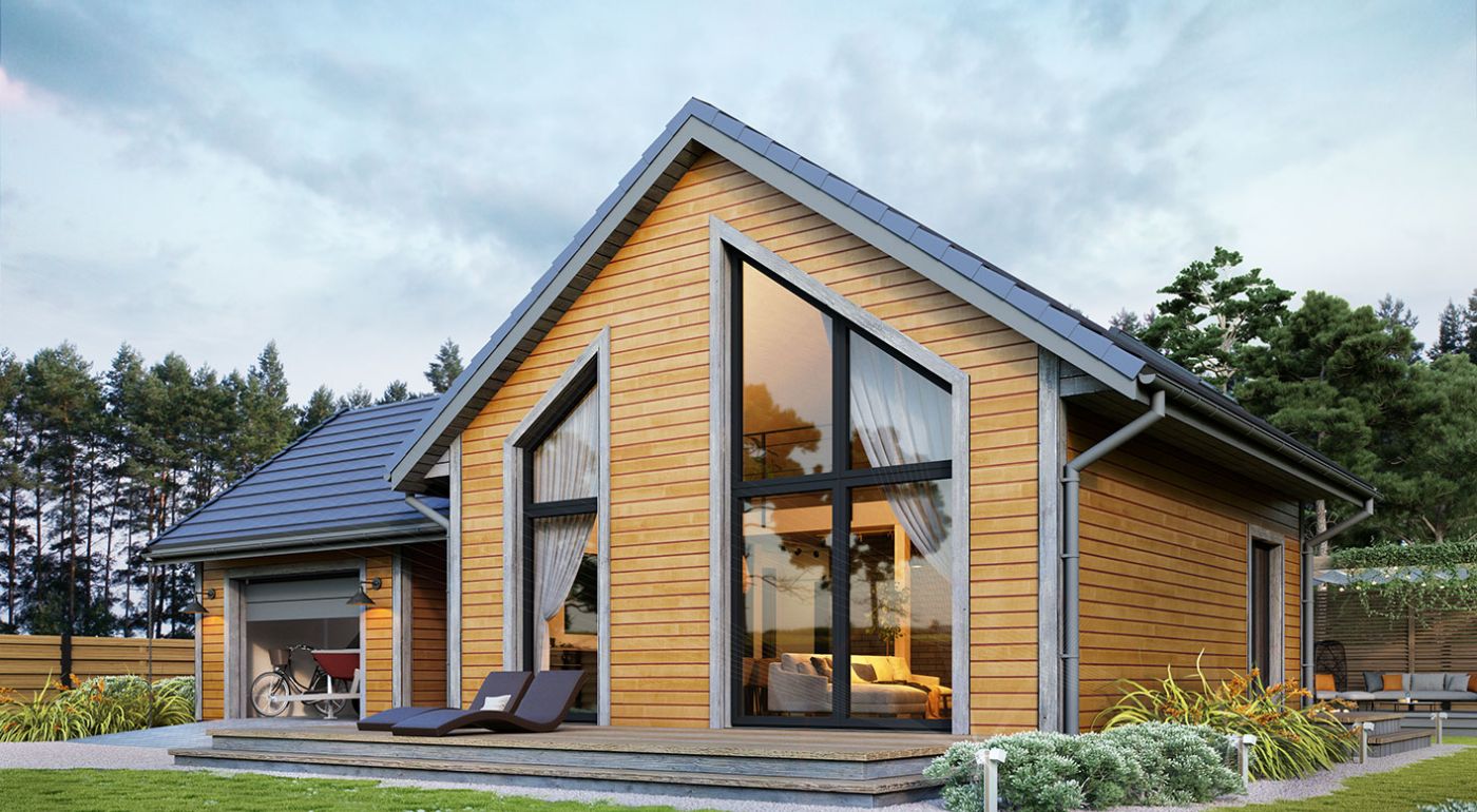 Erna 4 wooden — небольшой односемейный дом или летний домик с гаражом. На первом этаже расположена спальня и открытая гостиная с мезонином, что обеспечивает дополнительное пространство для любой планировки. В доме большое остекление фронтонной стены с выходом на террасу. В стандартной комплектации дом оборудован тепловым насосом и камином.