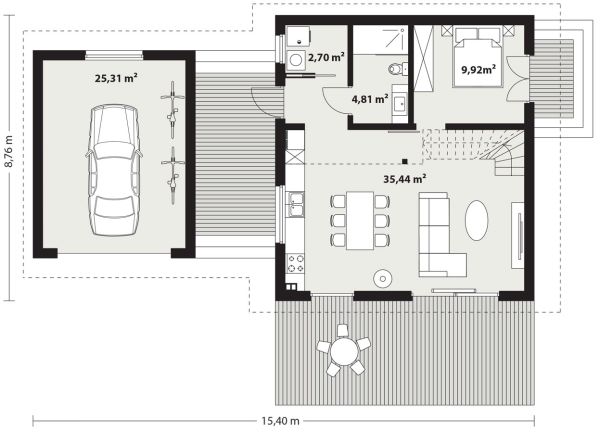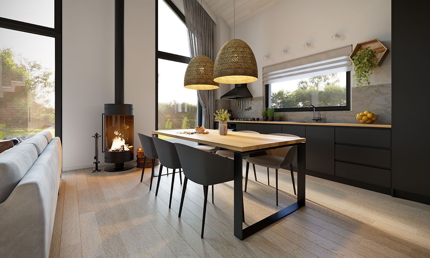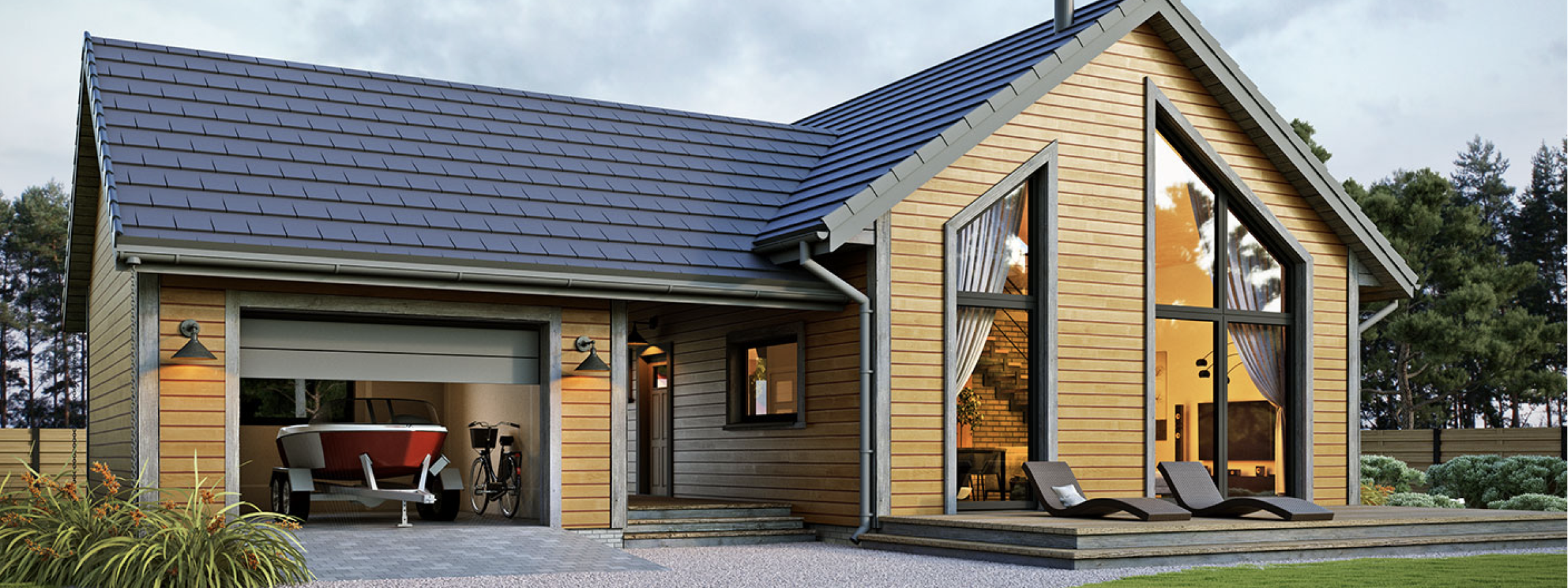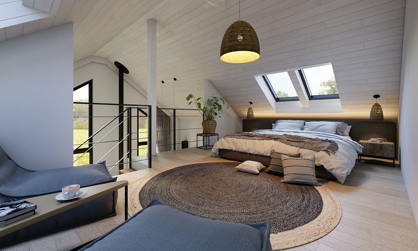 Erna 4 wooden — небольшой односемейный дом или летний домик с гаражом. На первом этаже расположена спальня и открытая гостиная с мезонином, что обеспечивает дополнительное пространство для любой планировки. В доме большое остекление фронтонной стены с выходом на террасу. В стандартной комплектации дом оборудован тепловым насосом и камином.